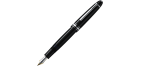 Le Meisterstück LeGrand, en résine précieuse noire ornée de détails platinés, avec un capuchon orné de l'emblème en forme d'étoile et une plume en or fabriquée à la main, incarne une icône du design Montblanc. Mécanisme Plume en or 14 K fabriquée à la main, incrustation rhodiée Stylo plume à piston Plume en or 14 K.